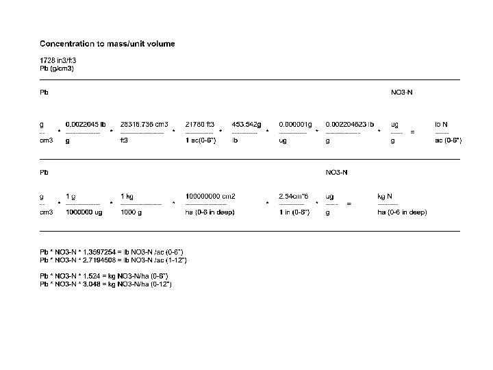 Example: Wheat (4081 kg/ha = 60 bu/ac) 2. 5%N in the grain =102. 03 kg N (4081 kg/ha = 60 bu/ac) 0. 36%P in the grain =14. 69 kg P Soil 0. 1% N*10000=1000 ug/g * 1. 47 * 1. 524 = 2240 kg N/ha 0 -15 cm NO 3 -N: 10 ug/g * 1. 47 * 1. 524 = 22. 40 kg NO 3 -N/ha 0 -15 cm NO 3 -N soil test is the actual N available at time X NO 3 -N soil test is valid for one point in time (1 crop or year) Some states predict N mineralization 0. 1% P*10000=1000 ug/g * 1. 47 * 1. 524 = 2240 kg P/ha 0 -15 cm P soil test is an index (sufficiency) of availability P soil test is valid for up to 5 years or more** 10 ug/g P, Mehlich III is not equal to 22. 40 kg P/ha We cannot predict P mineralization (102. 03/2240)*100 = 4. 5% (14. 69/2240)*100 = 0. 65%