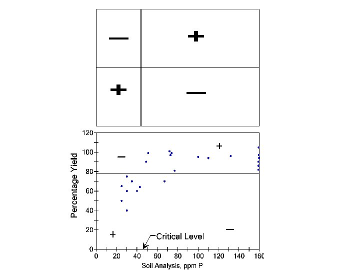 Cate and Nelson (1965) % yield versus soil test level Two Groups: 1. probability of response to added fertilizer is small 2. probability of response to added fertilizer is large A. Percent yield values obtained for a wide range in locations (fertilizer rate studies) Percent yield = yield at 0 level of a nutrient / yield where all factors are adequate B. Soil test values obtained (Check Plot) Will generate a single % yield and one soil test value for each location C. Scatter diagram, % yield (Y axis) versus soil test level (x axis) Range in Y = 0 to 100% D. Overlay -overlay moved to the point where data in the +/+ quadrants are at a maximum -point where vertical line crosses the x = critical soil test level