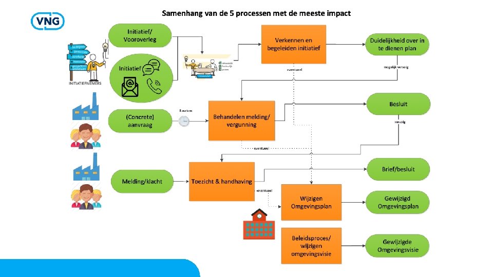 De processen in scope voor de Omgevingswet (basis = Gemma) Wijzigen omgevingsplan Verkennen en begeleiden initiatief Legenda Processen met hoogste prioriteit/ meeste impact Interbestuurlijke samenwerking Focus vandaag Beleidsproces/ wijzigen omgevingsvisie Monitoren en analyseren Behandelen aanvraag vergunning Behandelen bezwaar Toezicht en handhaving Verweren in beroep Beantwoorden vragen en voorlichten Sturende processen Primaire processen Processen met minder impact Brondatabeheer Ondersteunende processen