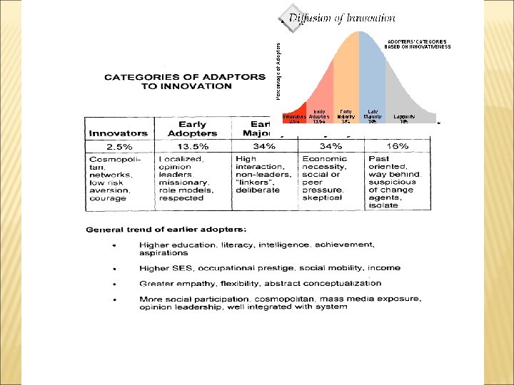 • think of an innovation in your field • describe different groups of employees in your organization who would respond early and favorably, as well as later and unfavorably • what are the differences between these groups? • how could you use this information to market the innovation to them more effectively?