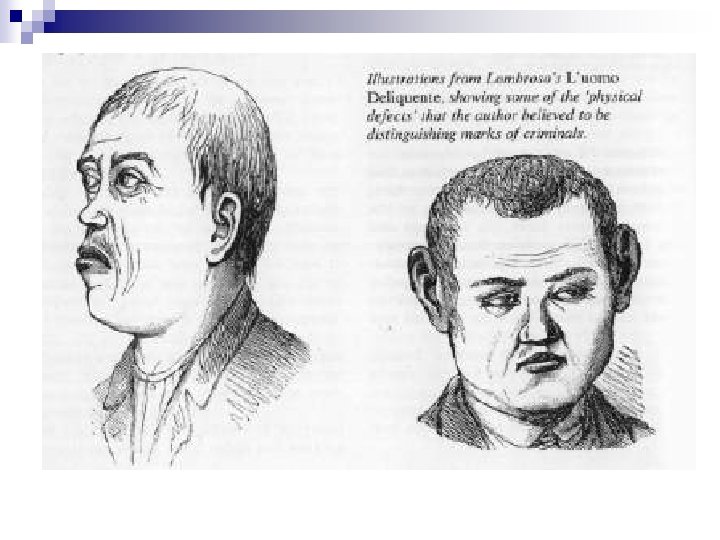 Early Biological Theories n n Lombroso in 1876 argued that the criminal is a separate species, a species that is between modern and primitive humans. He argued that the physical shape of the head and face determined the "born criminal".