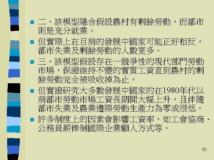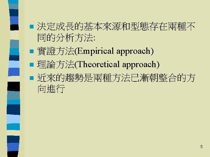 經濟發展的主要五大理論 Leading Theories of Economic Development: Five Approaches n n n 線性階段成長理論Linear-stages-ofgrowth model 結構變遷之理論與型態 Theories and patterns of structural change 國際依賴革命 International dependence 新古典自由市場之反革命 Neoclassical models 內生理論 Endogenous growth 6