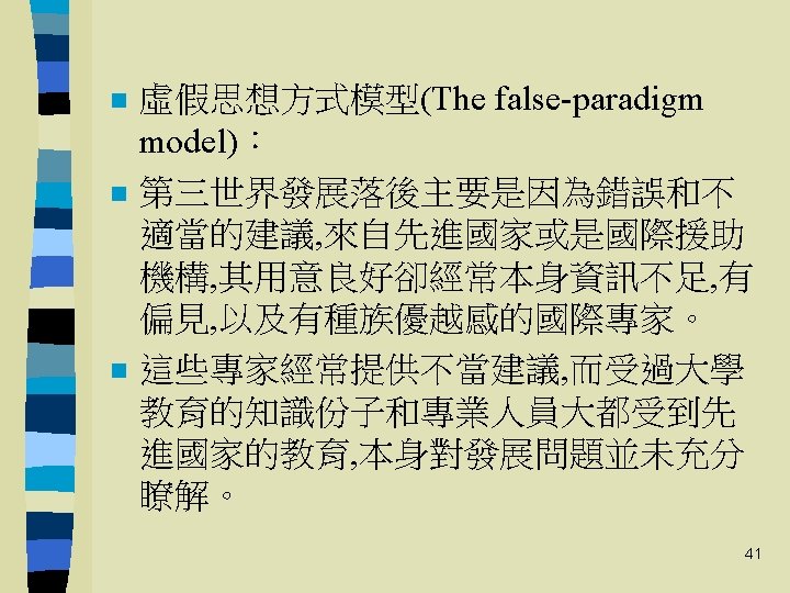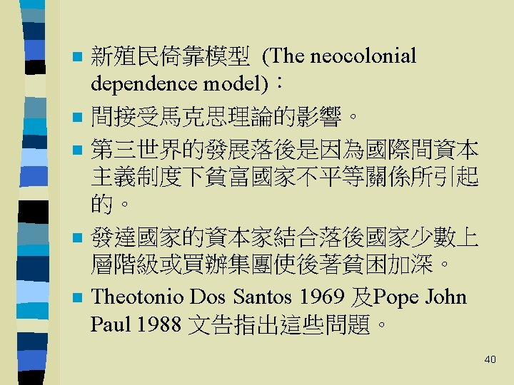 國際倚靠革命 The International. Dependence Revolution n n 1970年代 The neoclassical dependence model The false-paradigm model The dualistic-development thesis Conclusions and implications 38