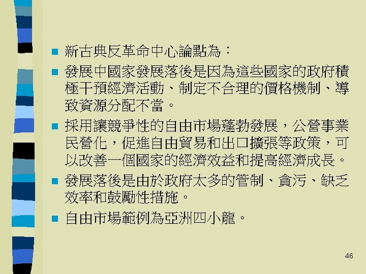 新古典反革命(The neoclassical Counterrevolution, 1980年代) n n n 1 Challenging the statist model: 自由市場理論 Free market approach 公共選擇理論 Public choice approach 市場友善理論 Market-friendly approach 2 Traditional neoclassical growth theory Conclusions and implications 45