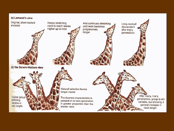 C. Problem: Why does the giraffe have a long neck? Answer: According to Lamarck’s theory ancestors of modern giraffes had short necks and ate grass and shrubs. Due to a change in environmental conditions the supply of food on the ground decreased. The giraffes had to stretch their necks to eat leaves on trees. Their necks became longer from stretching and this trait was passed to their offspring.
