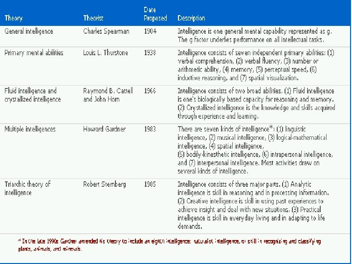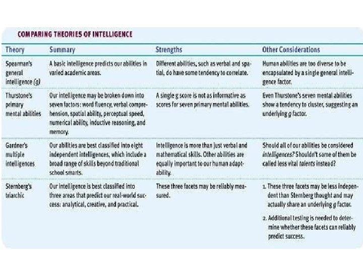 • Charles Spearman’ Two factor theory His hypothesis is all intellectual tasks must entail the exercise of a factor known as general intelligence(g factor) In examining correlation of various subsets of intelligence, he found that certain subsets tend to correlate higher than others Each individual type of item requiring "specific factor" called "S" factor.