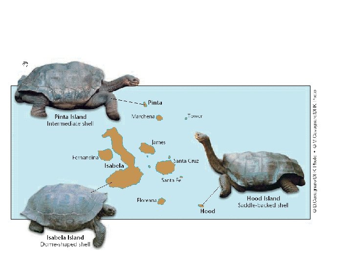 • Darwin observed plants and animals on the Galapagos Islands • Examples: • Finches had different types of beaks on the different islands adapted to their type of food gathering. • Tortoises on different islands had different neck lengths.