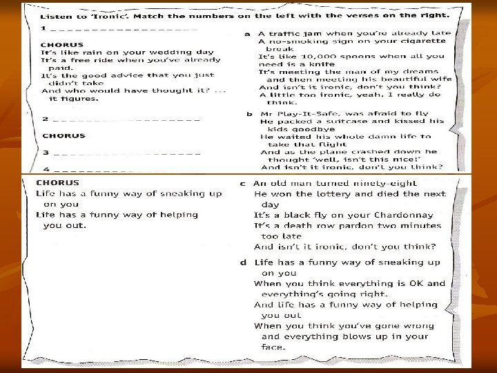 n n Students’ song or Teacher’s song Pre-discussion → Worksheet#64 → Instructions → Compare and Check answers → Listen again → Read the answer with song → Asking question about song → Explanation → Listen again