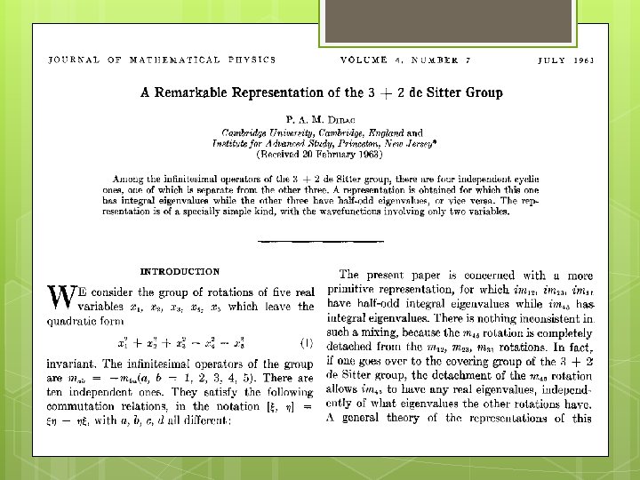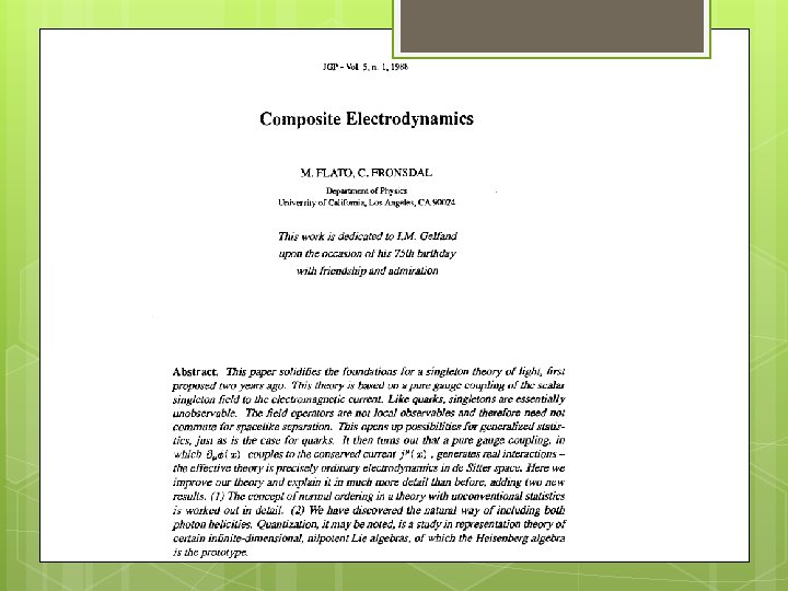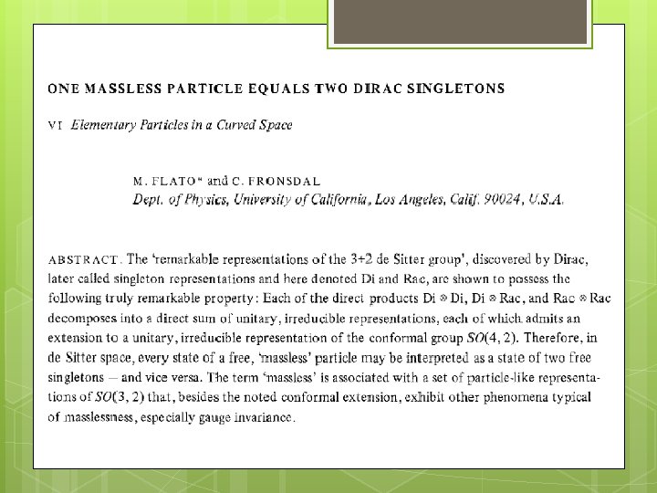 Singleton representations Most degenerate representations first discovered by Dirac Massless particles are composites of two singletons No Poincare counterparts to singletons. At flat space limit, singletons become vacua. QED and electroweak can be understood in terms of singletons. Locally unobservable.