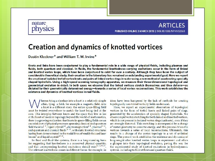 Particles as topological objects 1. 2. 3. 4. First attempt dates back to Kelvin’s (William Thomson) vortex atom model in 1867. Developed after observing Peter Taits demonstrations of vortex smoke rings and noting that: they behaved as independent solids. They rebounded upon collision Exhibited oscillating vibration modes Were indivisible