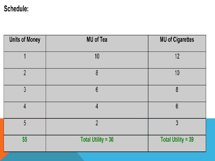 q From the above table, it is clear that in a given span of time, the first glass of water to a thirsty man gives 20 units of utility. q When he takes second glass of water, the marginal utility goes on down to 12 units; q When he consumes fifth glass of water, the marginal utility drops down to zero and if the consumption of water is forced further from this point, the utility changes into disutility (-3). q Here it may be noted that the utility of then successive units consumed diminishes not because they are not of inferior in quality than that of others. q We assume that all the units of a commodity consumed are exactly alike. The utility of the successive units falls simply because they happen to be consumed afterwards.