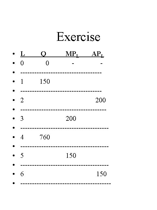Exercise • • Input Output L K Combo A 100 20 40 B 250 40 80 C 600 90 180 D 810 126 252 A) Calculate % in each of K, L, and Q in moving from A B, B C, and C D. • B) Are there increasing, decreasing or constant returns to scale between A and B? B and C? C and D?