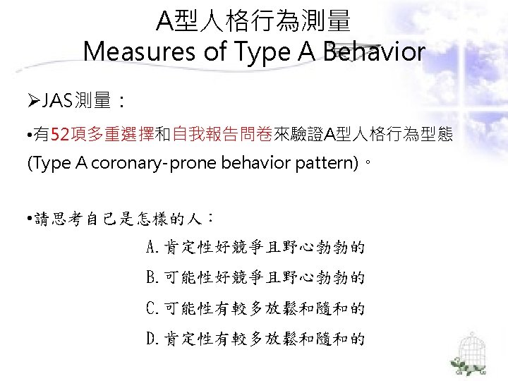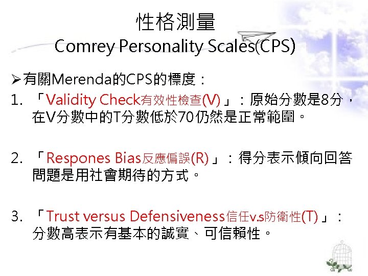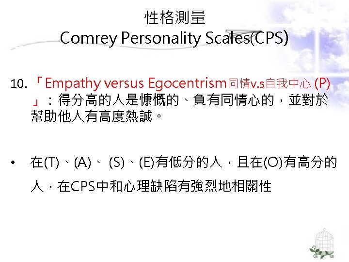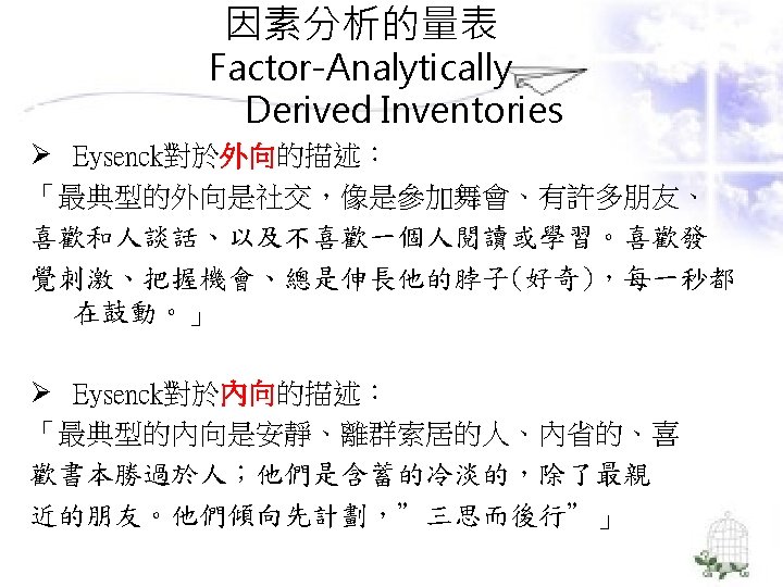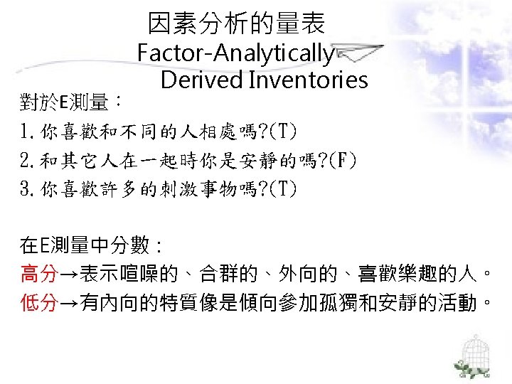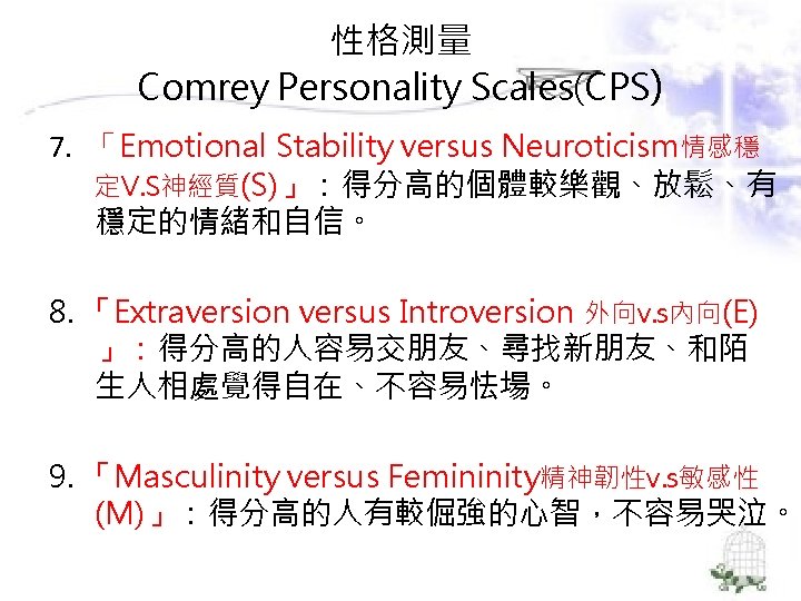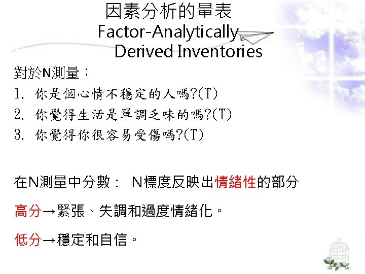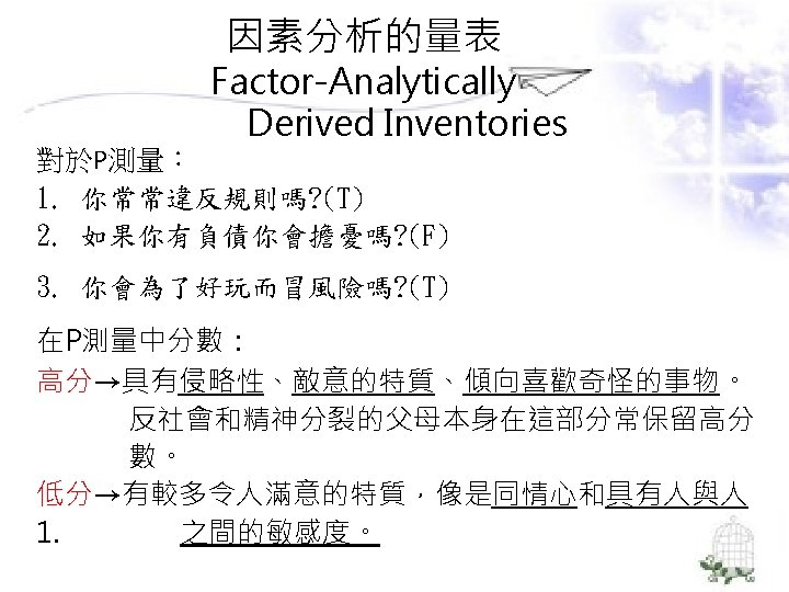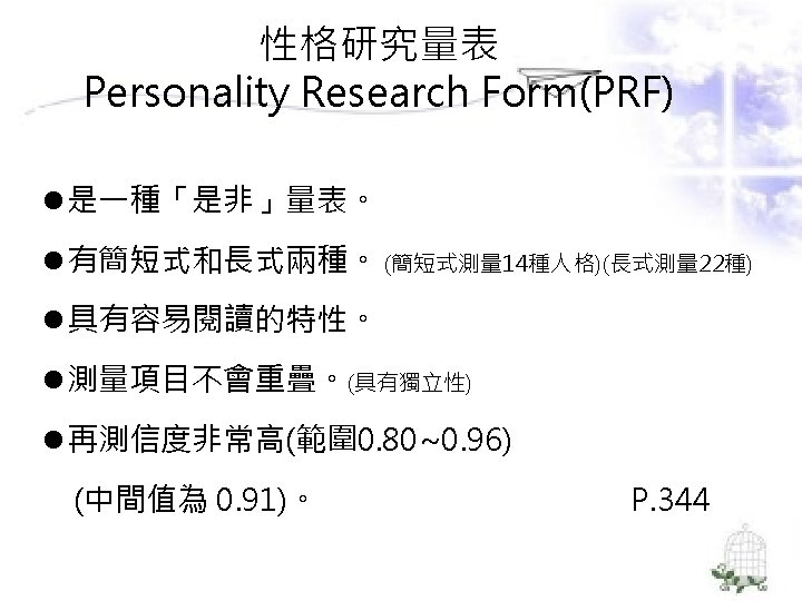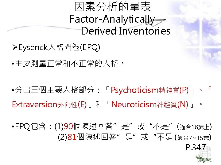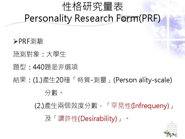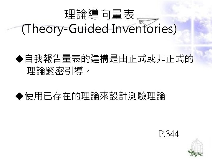 理論導向量表 (Theory-Guided Inventories) l「性格研究量表」(Personality Research Form) l「A型人格行為型態」(Type A coronaryprone behavior pattern) l「狀態-特質焦慮量表」(State –Trait Anxiety Inventory):企圖去測量特定的人格組成成 分。