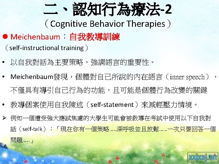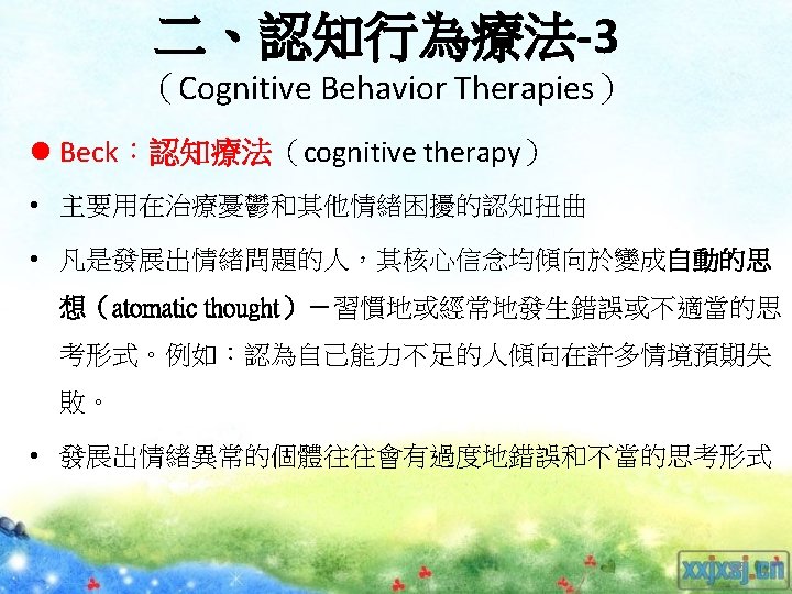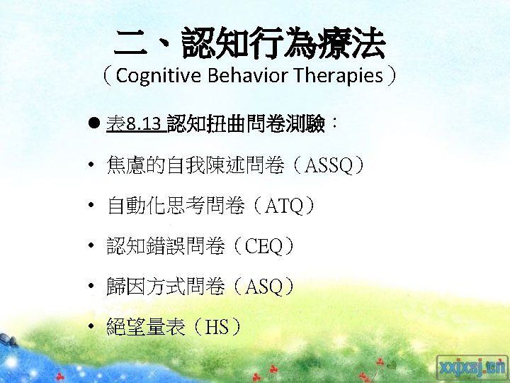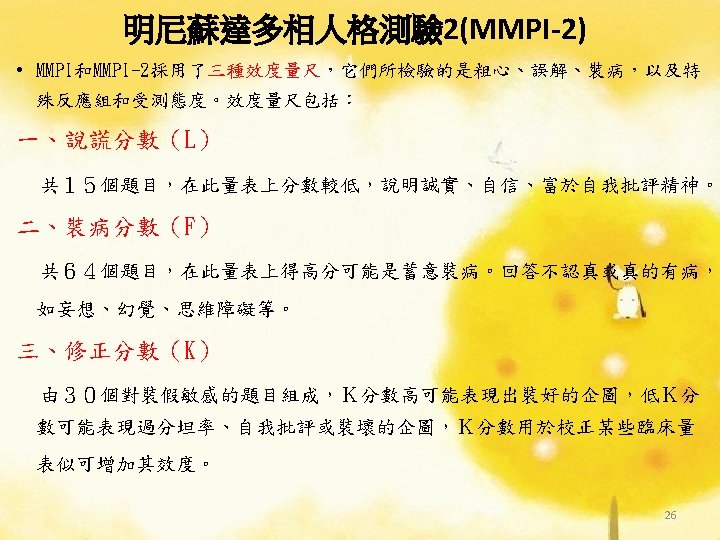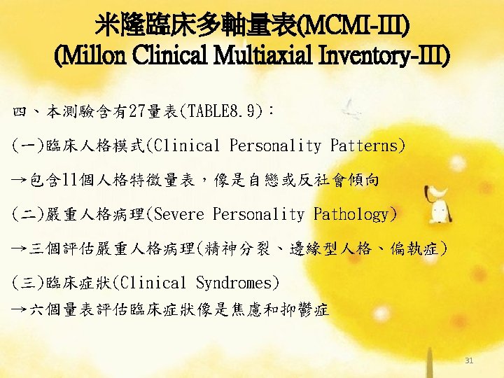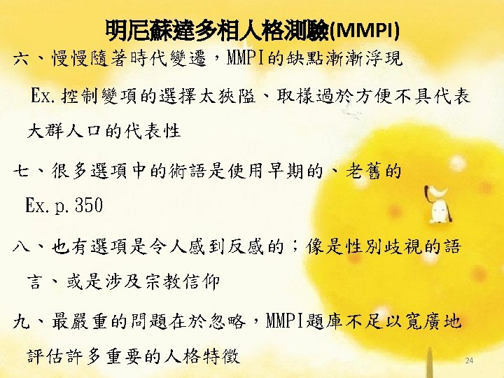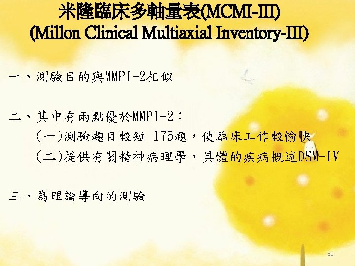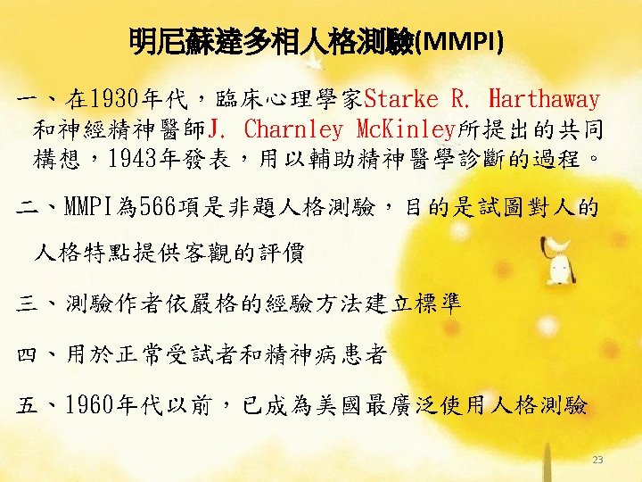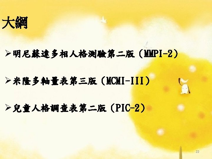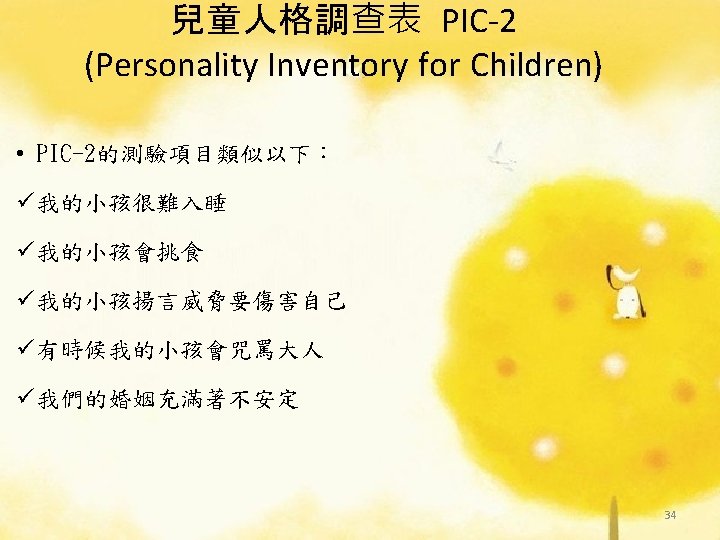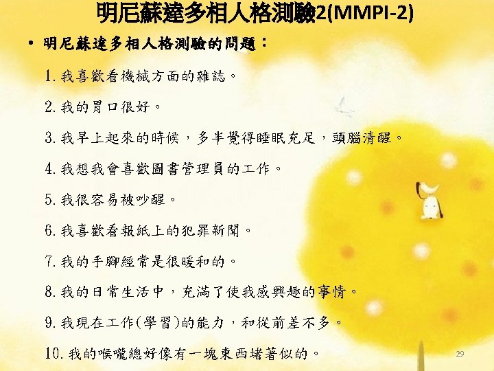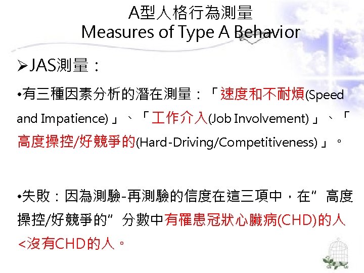 理論導向量表 (Theory-Guided Inventories) l「性格研究量表」(Personality Research Form) l「A型人格行為型態」(Type A coronaryprone behavior pattern) l「狀態-特質焦慮量表」(State –Trait Anxiety Inventory):企圖去測量特定的人格組成成 分。
