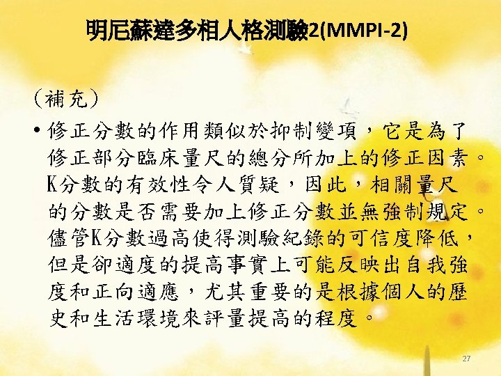 性格研究量表 Personality Research Form(PRF) l. Edwards 和Abbott發現PRF和Edward Personality Inventory(EPI)中有相似測量特別高和有確定的交互作 用情形。 ØPRF和EPI測量之間如以下: PRF X EPI 係數 成就 Achievement X 努力 作Hard Work 0. 74 改變Change X 喜歡處於規律中Likes a Set Routine ─0. 54 撫養 Nurturance X 幫助別人Help Others 0. 64 Succorance X 獨立Dependent 0. 73