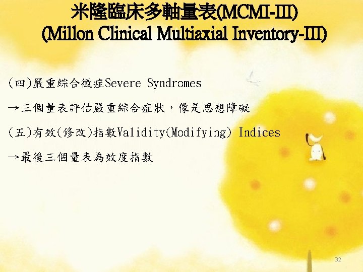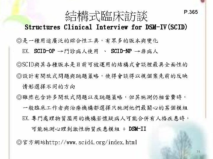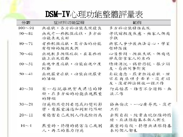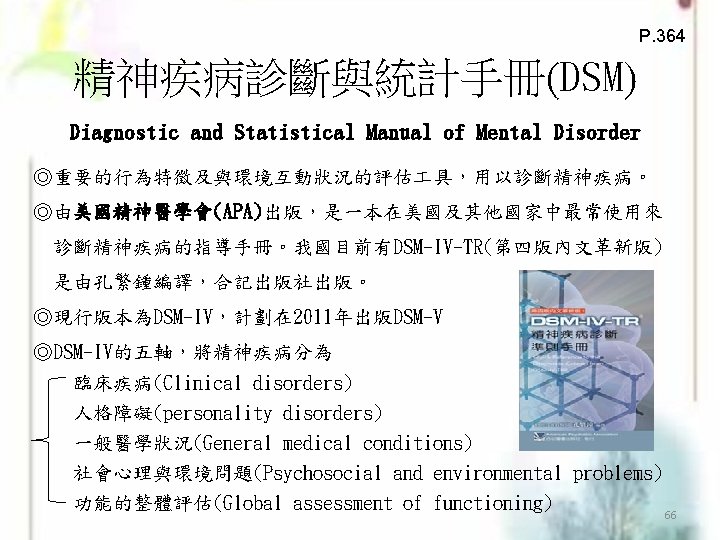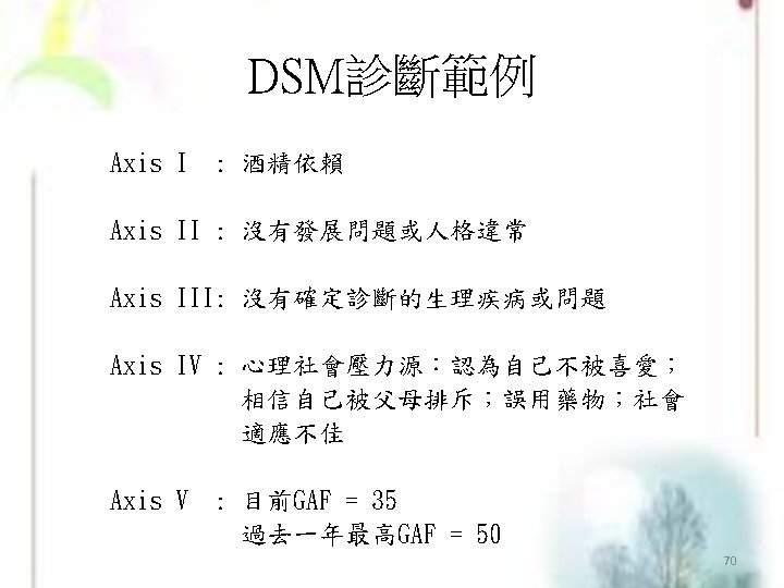 DSM的功能-Andreasen and Black(1995)提出 ◎降低臨床現象的複雜性 (Reducing the complexity og clinical phenomena) ◎促進臨床醫師間的交流 (Facilitating communication between clinicians) ◎預測此疾病造成的結果 (Predicting the outcome of the disorder) ◎決定適當的治療方式(Deciding on an appropriate treatment) ◎協助尋找病因(Deciding on an appropriate treatment) ◎確定全球此疾病的流行 (Determining the prevalence of diseases worldwide) ◎決定保險項目的涵蓋範圍 (Making decisions about insurance coverage) 71