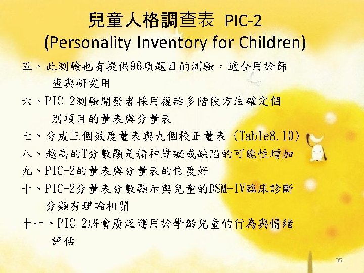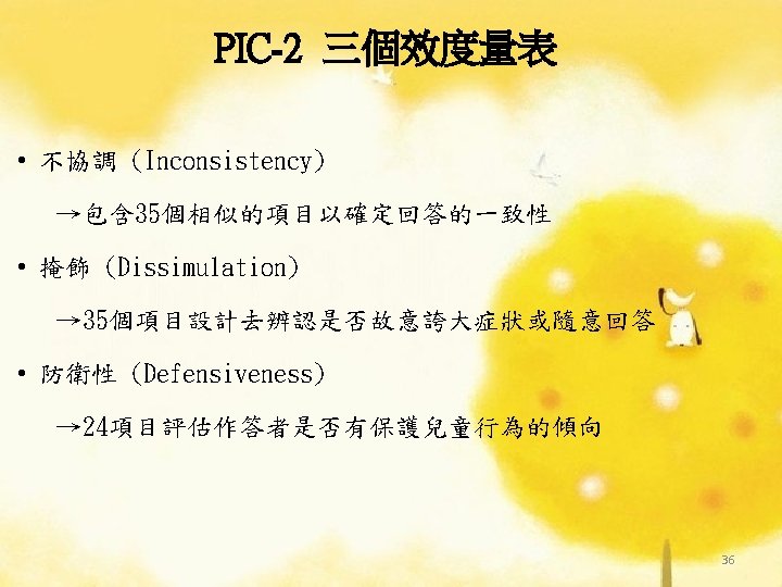 TABLE 8. 10 校正量表與分量表 ü 認知障礙(Cognitive Impairment) ü 衝動與分心(Impulsivity and Distractibility) ü 犯罪(Delinquency) ü 家庭功能障礙(Family Dysfunction) ü 現實扭曲(Reality Distortion) ü 身體關注(Somatic Concern) ü 心裡不適(Psychological Discomfort) ü 社會退縮(Social Withdrawal) ü 社會技能不足(Social Skill Deficits) 37