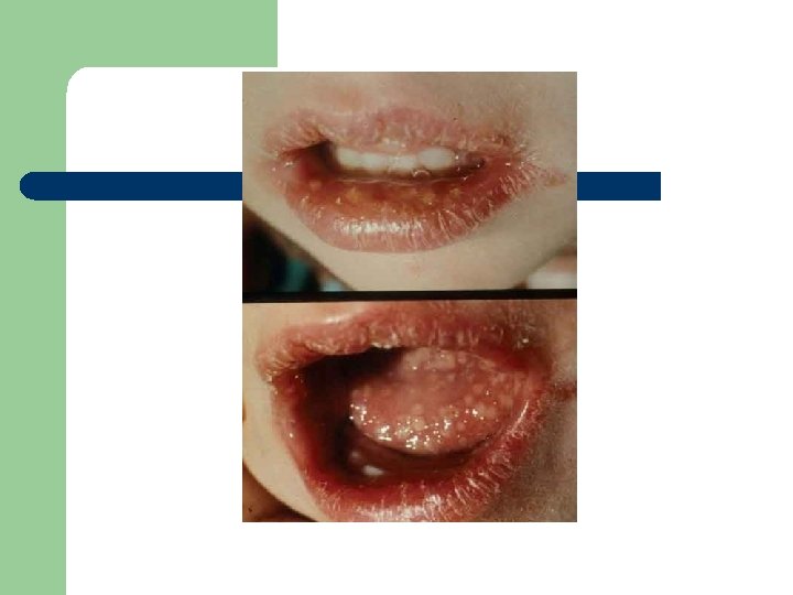 Viral infections of the mouth Such as : Herpes simplex virus (HSV) - responsible for common vesicular eruptions of the skin and mucosa. Although oral infection with HSV-1 and HSV-2 is described below, most oral-facial herpetic lesions are due to HSV-1. Antibodies indicating past infection are virtually ubiquitous in adults.