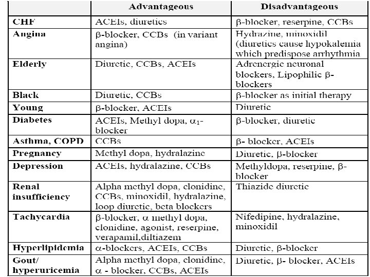 Choice of antihypertensive drugs in special situations: Clinical situation Preferred drug Hypertension in pregnancy α Methyl dopa, hydralazine, labetalol and nifedipine Hypertension and diabetes ACEI , α Methyl dopa Hypertension and bronchial asthma CCB Hypertension and renal failure , CCB clonidine, α Methyl dopa, Loop diuretics (frusemide) Hypertension and heart failure Diuretics and ACEI