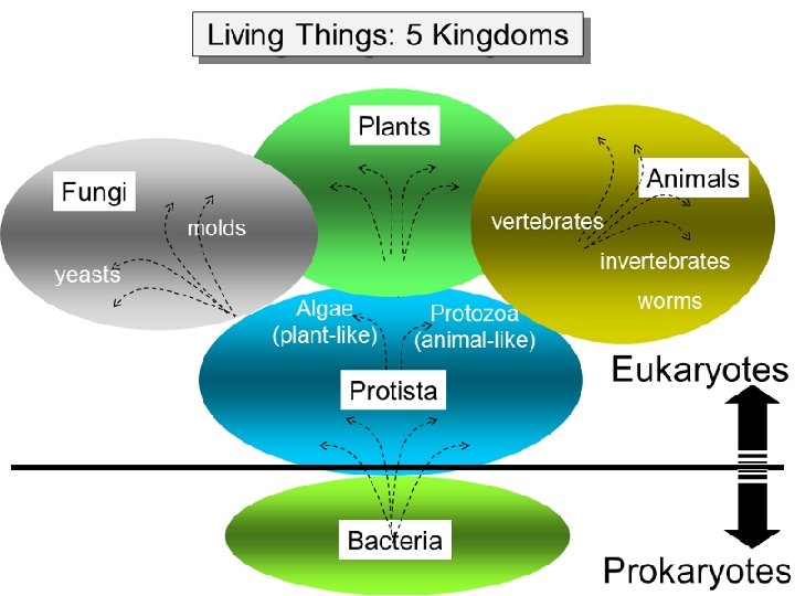 There are five kingdoms of living organisms. Kingdom 1 - Monera Characteristic Prokaryotic Eample Bacteria Actinomycetes 2 -Protista 3 -Fungi 4 -Plantae 5 -Animalia Eukaryotic Protozoa Fungi Plants, Algae Arthropods Mammals Man