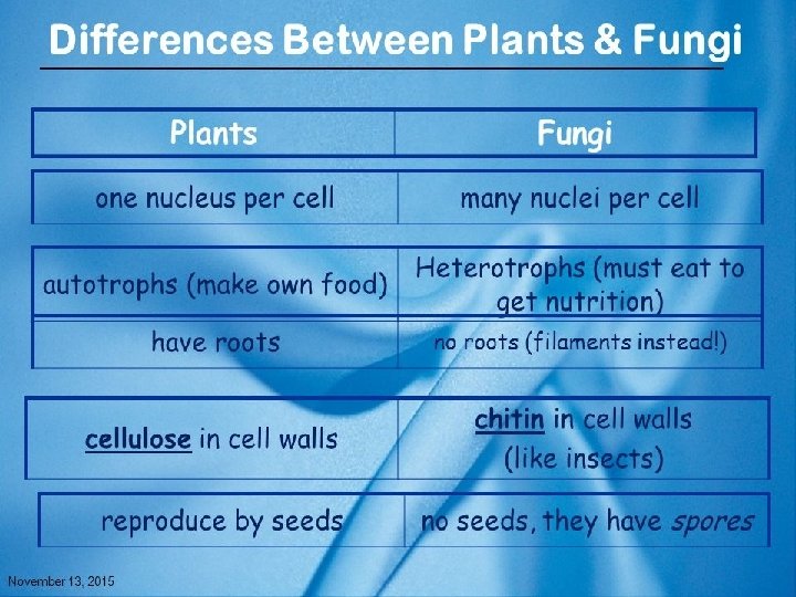 • A fungus (plural: fungi or funguses) is a member of a large group of eukaryotic organisms that includes microorganisms such as yeasts and molds (British English: moulds), as well as the more familiar mushrooms. These organisms are classified as a kingdom, Fungi, which is separate from plants, animals, protists and bacteria. One major difference is that fungal cells have cell walls that contain chitin, unlike the cell walls of plants and some protists, which contain cellulose, and unlike the cell walls of bacteria. The fungi are in the Kingdom Fungi. • *Eukaryotic organisms : - have nuclear membrane surrounding nucleus • Prokaryotic organisms : -nucleus lack nuclear membrane