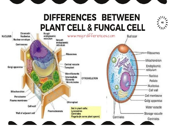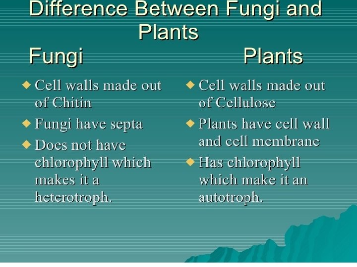 • Fungus, such as mushrooms, yeast, and mold, are eukaryotic, non-motile organisms that are heterotrophic, which means that they must take in nutrients for energy. They have cell walls made of chitin. We can see these differences highlighted in the comparison here. While both are eukaryotic and don't move, plants are autotrophic - making their own energy - and have cell walls made of cellulose, but fungi are heterotrophic - taking in food for energy - and have cell walls made of chitin.