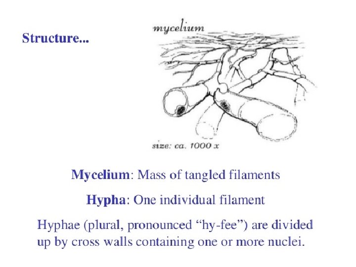 • Mycology is the branch of biology concerned with the study of fungi which includes yeast and molds. Myco= derived from Greek word mykes is mean Mushroom and -logy= study • fungi singular fungus a group of eukaryotic , no phototrophic organisms with rigid cell walls , that includes molds , yeast and mushroom. • Molds represent the basic structure of all fungi: a weblike network of microscopic strands called mycelium (a hypha (plural hyphae) is a long, branching filamentous structure of a fungus ).