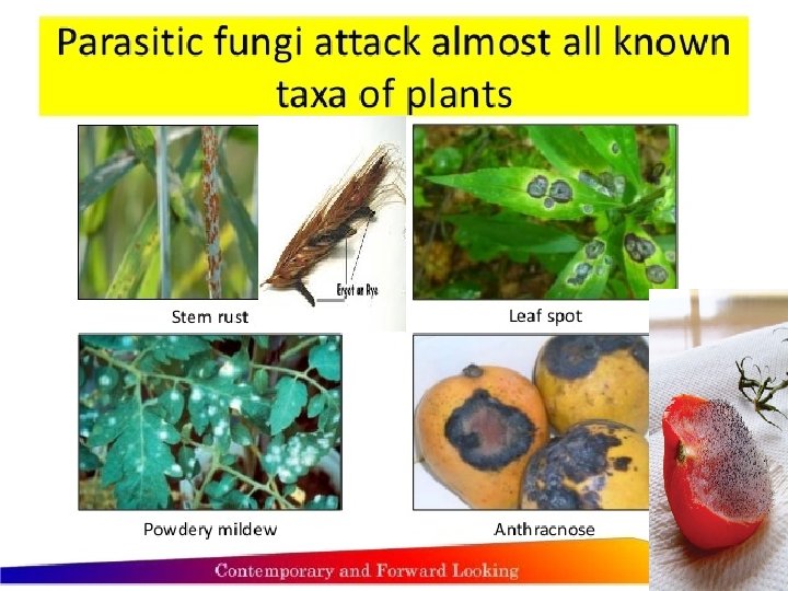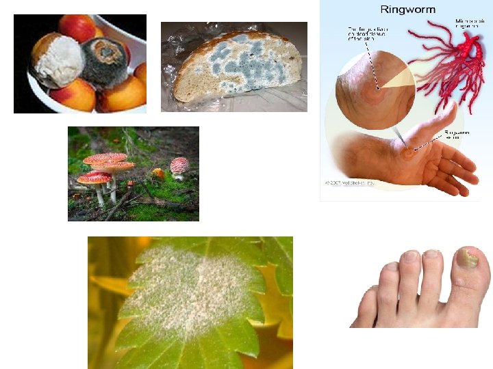 B- Harmful Effects of Fungi: 1. Destruction of food, lumber, paper, and cloth. 2. Animal and human diseases, including allergies. 3. Toxins produced by poisonous mushrooms or within food • 4. Plant diseases. • 5. Spoilage of agriculture products such as vegetables and cereals • 6. Damage the products such as magnetic tapes and disks, glass lenses, bones and wax. • •