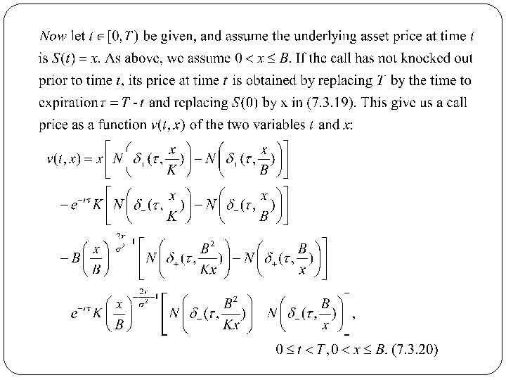 7. 3. 2 Black-Scholes-Merton Equation Theorem 7. 3. 1 Let v( t, x) denote the price at time t of the up-and-out call has not knocked out prior to time t and S(t)= x. then v(t, x) satisfies the Black-Scholes-Merton partial differential equation ( 7. 3. 4) in the rectangle satisfies the boundary conditions and ( 7. 3. 5) (