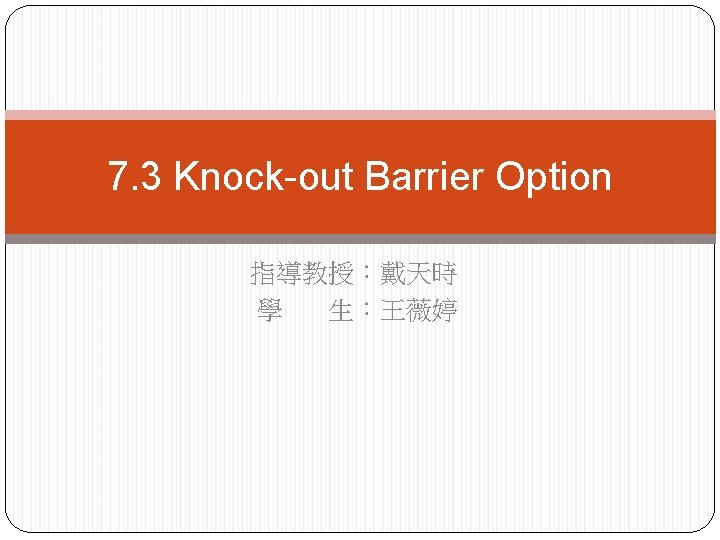 7. 3. 1 Up-and-Out Call Our underlying risky asset is geometric Brownian motion Where is a Brownian motion under the risk -neutral measure. Consider a European call, expiring at time T, with strike price K and up-and-out barrier B. We assume K<B; otherwise, the option must knock out in order to be in the money and hence could only pay off zero.