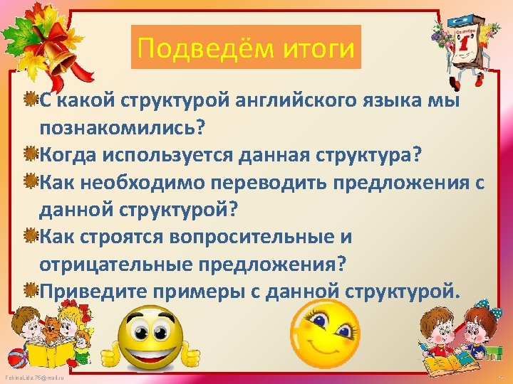 Сделай предложения отрицательными или вопросительными 1) There is a book on the table. (-) 2) There are many trees in the park. (? ) 3) There a lot of shops in London. (-) 4) There is a computer in our classroom. (? ) 5) There are many boys and girls in the park. (-) 6) There is a bird in the tree. (? ) Fokina. Lida. 75@mail. ru