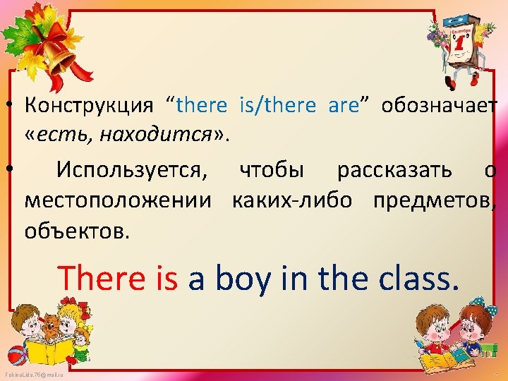 утвердительноe предложение There Fokina. Lida. 75@mail. ru is a are what where is are There’s There’re