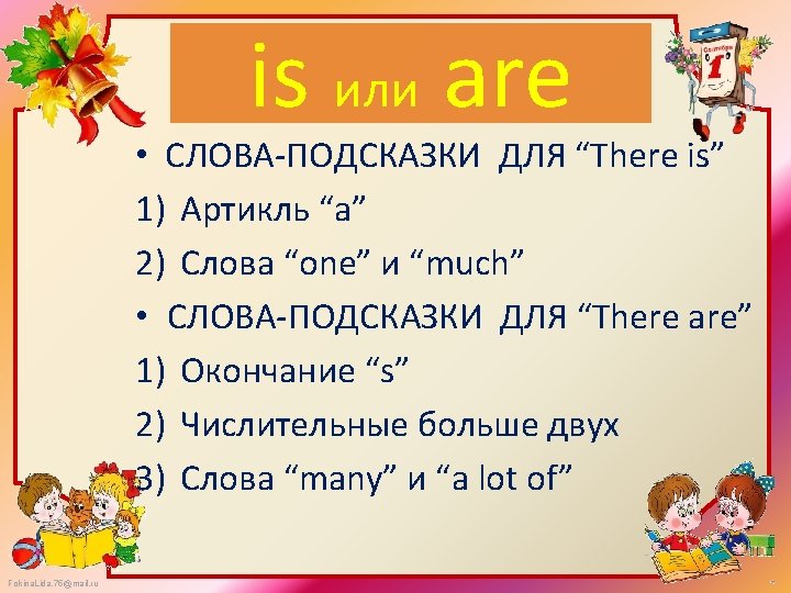 is или are is 1) There _____ a hamburger on the plate. are 2) There _____ many little trees in the park. are many children in our school. 3) There _____ is 4) There _____ a big tree in the garden. are 5) There _____ many boys and girls in the park. is 6) There _____ a toy monkey in the box. Fokina. Lida. 75@mail. ru