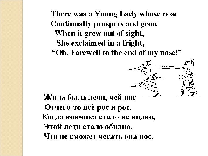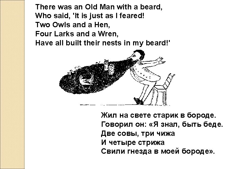 Task: try to complete the following limerick Lady whose bonnet, There was a Young ______ birds Came untied when the _____sat upon it; But she said: 'I don't care! air All the birds in the ___ sit on my bonnet!' Are welcome to _____ К привлекательной леди из Капуи Часто птицы садились на шляпу, и Говорила с любовью «Пусть сидят на здоровье!» Та приятная леди из Капуи.