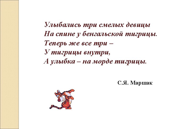 There was a young lady of Niger, Who smiled when she rode on a tiger, They returned from the ride, With the lady inside, And a smile on the face of the tiger.