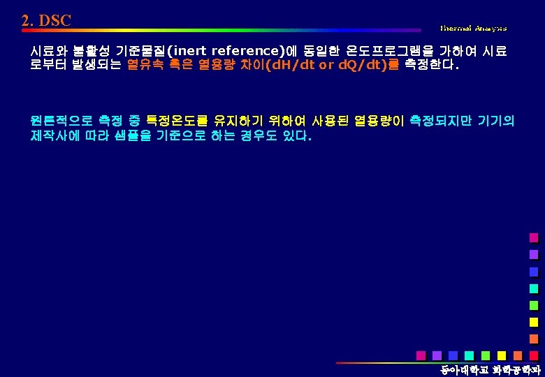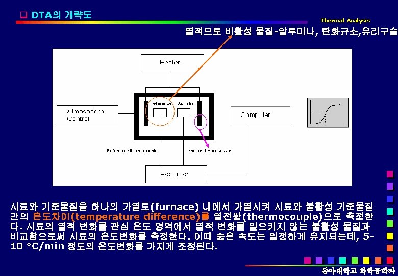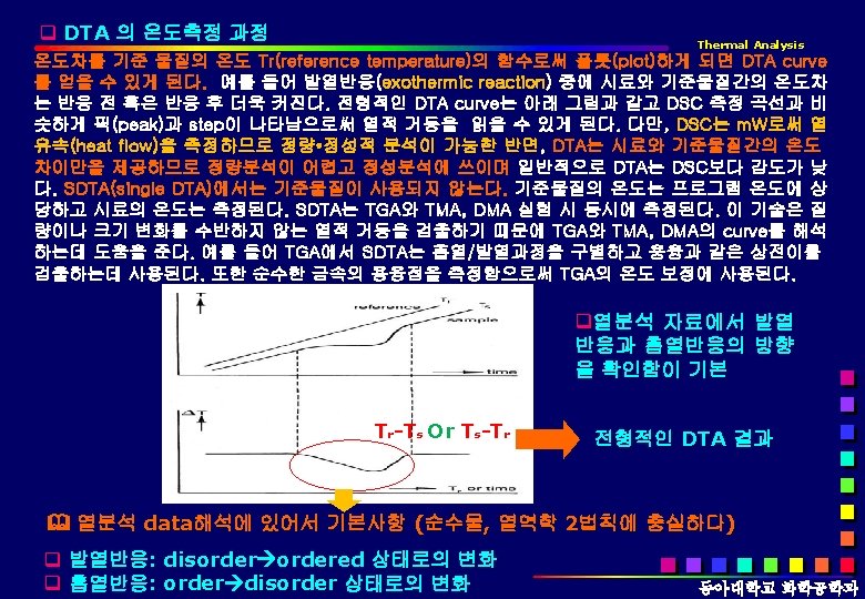 1. DTA Thermal Analysis DTA is a technique measuring the difference in temperature between a sample and a reference (a thermally inert material) as a function of time or temperature q q DTA는 모든 종류의 전이, 전환을 관찰할 수 있다. 동아대학교 화학공학과