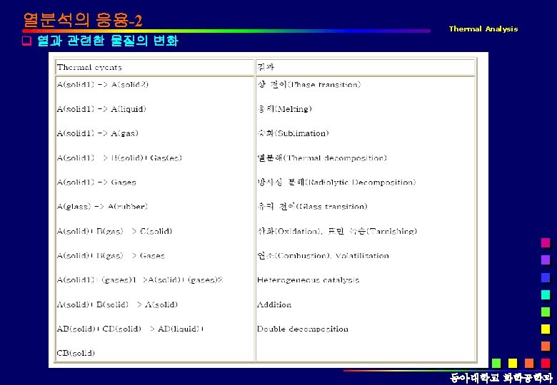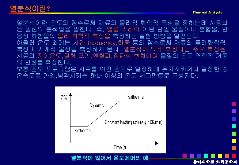열분석의 정의 Thermal Analysis q ICTAC(International Confederation of Thermal Analysis and Calorimtry) Measurement of changes in physical or chemical properties of materials as a function of temperature, usually heating or cooling at a uniform rate. 물질의 변화 에너지: 광에너지(광분석) 열에너지(열분석) 동아대학교 화학공학과