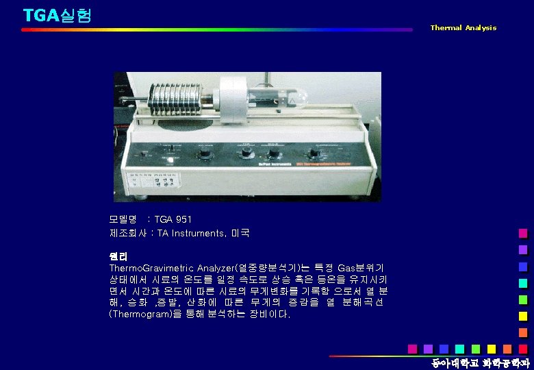 TGA실험 Thermal Analysis q TGA의 일반적인 구조 위치에 따라 따라 투과율이 다른 다른 소자 IR Detector 빛에 의한 측정 + Balance Quartz Tube Purge gas input Sample pan Furnace Thermocouple Exhaust 동아대학교 화학공학과