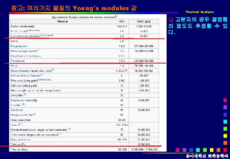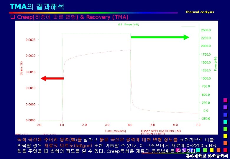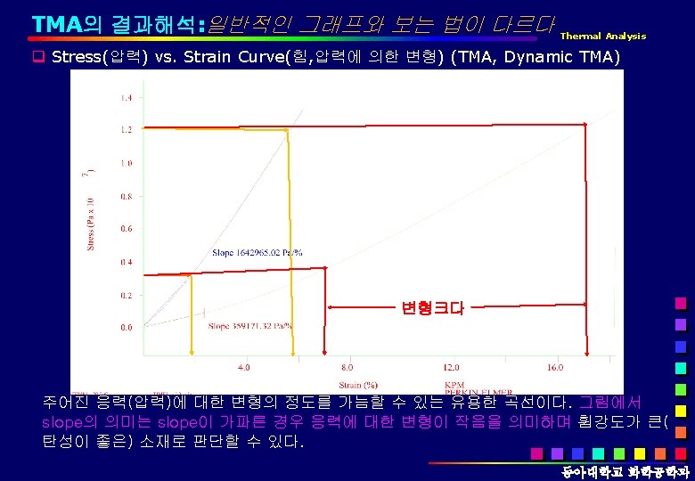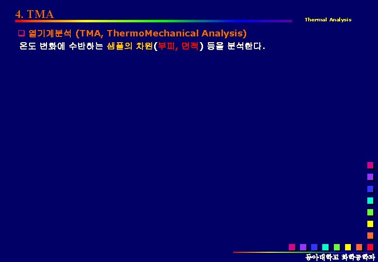TMA의 응용분야 Thermal Analysis q 응용분야 q. TMA Tg, CTE(Coefficient of linear thermal expansion, 선형열팽창 계수) 등. q. DMA Tg, Storage & Loss Modulus, Tangent Delta, Stress vs. strain, Creep & Recovery, etc. 동아대학교 화학공학과