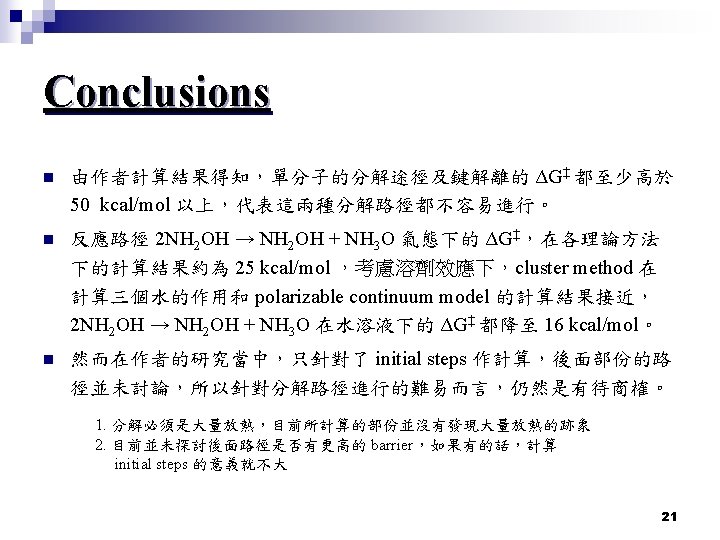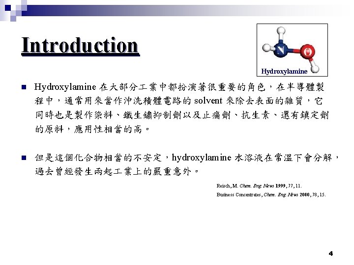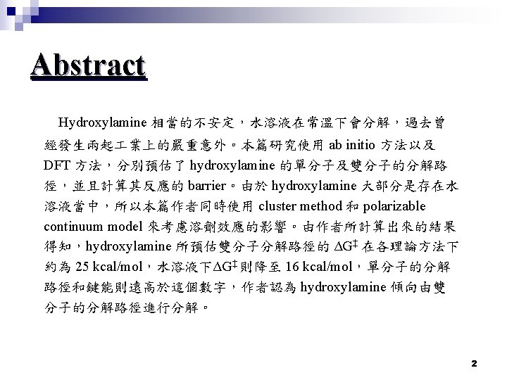 Introduction Hydroxylamine n 由實驗結果得知,hydroxylamine 在水溶液中分解到最後的產物分別是 NH 3、H 2 O、 N 2、N 2 O 以及少量的 NO 和 H 2,且這個反應大部分研究 都是針對 overall 的反應,缺少反應的 mechanism 。 Papadaki, M. I. ; Pontiki, E. ; Liu, L. ; Rogers, W. J. ; Mannan, M. S. J. Chem. Eng. Data 2009, 54, Cisneros, L. O. ; Wu, X. ; Rogers, W. J. ; Mannan, M. S. ; Park, J. ; North, S. W. Process Saf. Environ. Prot. 2003, 81, 121 n 目前實驗上除了上述那些最終分解出來的氣體,另外還發現了中間產 物 HNO。兩個 hydroxylamine 會發生自身氧化還原反應,產生 H 2 O、 NH 3、HNO,所以作者在此處把兩個 hydroxylamine,也就是雙分子的 分解反應途徑也考慮進去計算。 Nast, R. ; Foppl, I. Z. Anorg. Allg. Chem. 1950, 263, 310 5