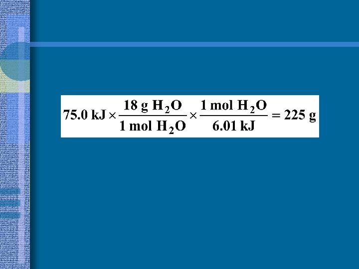 l How many grams of ice at 0°C can be melted into water at 0°C by the addition of 75. 0 k. J of heat? l Hfus for water = 6. 01 k. J/mol