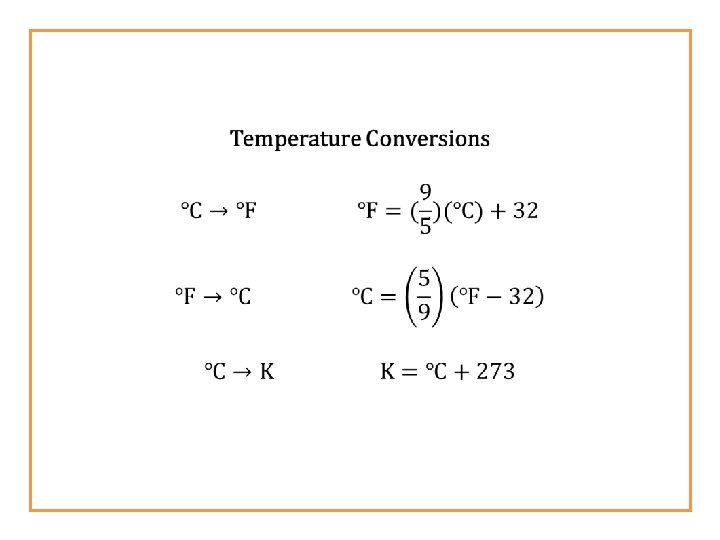 Temperature Conversions TK = Temperature in Kelvin TC = Temperature in °C TF = Temperature in °F Temperature (°F) 212 32 0 Temperature (°C) 100