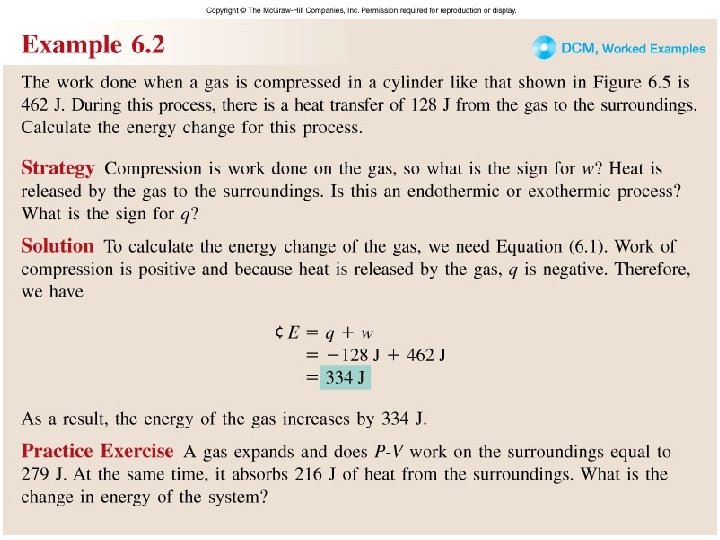 A Comparison of DH and DE 2 Na (s) + 2 H 2 O (l) 2 Na. OH (aq) + H 2 (g) DH = -367. 5 k. J/mol DE = DH - PDV At 25 0 C, 1 mole H 2 = 24. 5 L at 1 atm PDV = 1 atm x 24. 5 L = 24. 5 L. atm = 2. 5 k. J DE = -367. 5 k. J/mol – 2. 5 k. J/mol = -370. 0 k. J/mol In case of ideal gases and at constant temperature DE = DH – RT Dn 6. 4