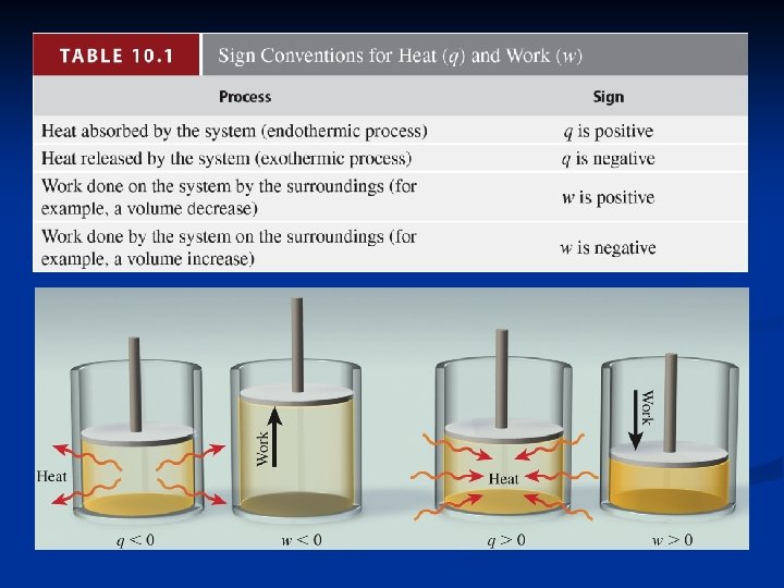 Energy, Work and Heat As the system loses energy to the surroundings, it can do so by losing heat (q), and/or doing work (w). As a result, ΔE = heat + work ΔE = q + w
