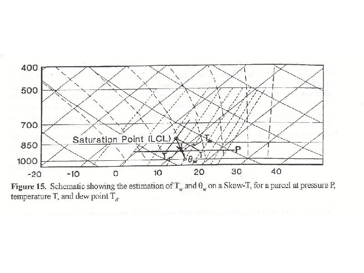 Rotating plot and plotting profile The diagram is rotated through 45° so that the pressure lines are quasihorizontal Temperature and Dew point are plotted on the diagram. Dew point is simply plotted as a temperature. Here: Pressure, mb Temp. , °C Dew point, °C 1000 20 15 900 10 9 850 11 5 700 0 -15 500 -25 -40 300 -55 200 -60 100 -60