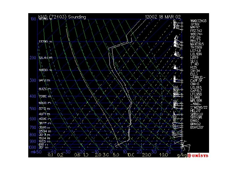 Adding Moisture information • Dew point is a measure of moisture content. The tephigram can be used to convert (TD, T) to mixing ratio • Mass mixing ratio isopleths are light dashed lines. Units are g kg-1 • Curved lines are saturated adiabats – the path a saturated parcel of air follows on adiabatic ascent