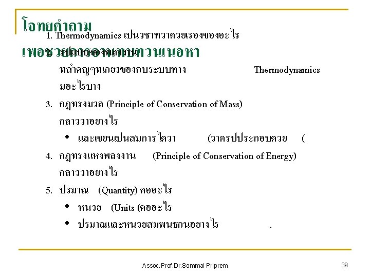 Chapter Outline 1 -1 Thermodynamics and Energy 1 -2 A Note on Dimensions and Units 1 -3 Closed and Open Systems 1 -4 Properties of a System 1 -5 State and Equilibrium 1 -6 Processes and Cycles 1 -7 Forms of Energy 1 -8 Energy and Environment 1 -9 Temperature and the Zeroth Law of Thermodynamics 1 -10 Pressure 1 -11 The Manometer 1 -12 Barometer and the Atmospheric Pressure Assoc. Prof. Dr. Sommai Priprem 38
