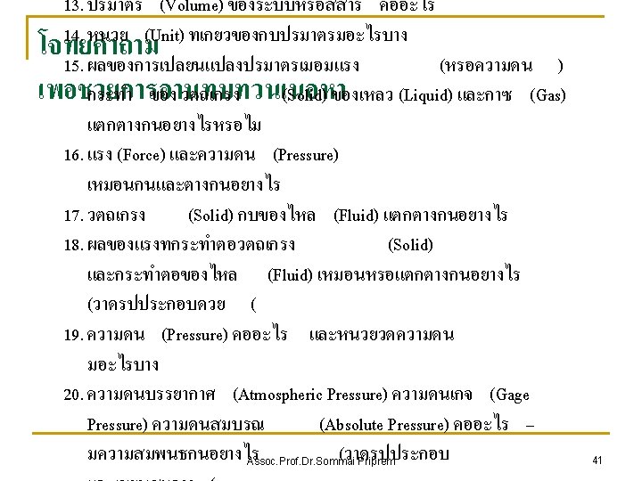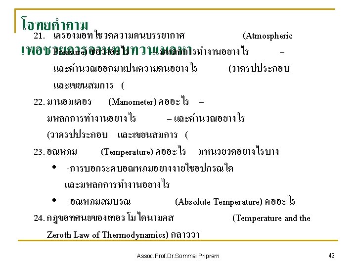 Properties of a system n Any characteristic of a system in equilibrium is called a property. n Intensive Extensive n Assoc. Prof. Dr. Sommai Priprem 20