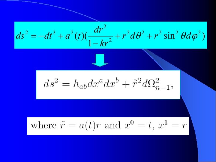 f) Conclusions 1) From d. Q=Td. S to Friedmann equations, here S=A/4 G and 2) 2) The Friedmann equation can be recast to a universal form 3) There is a Hawking radiation for the apparent horizon in FRW univers 4) In Einstein gravity and Lovelock gravity, the expression of S has a same form as the black hole entropy 5) In brane world scenario, that form still holds, and we can obtain an expression of horizon entropy associated with apparent horizon, and expect it also holds for brane world black hole horizon.