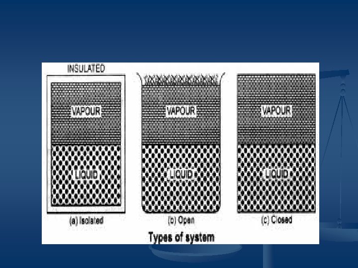 TYPES OF SYSTEM q OPEN SYSTEM: IT CAN EXCHANGE BOTH MATTER AND ENERGY WITH THE SURROUNDING. q CLOSED SYSTEM: IT CAN EXCHANGE ONLY ENERGY WITH THE SURROUNDING BUT NOT MATTER. q ISOLATED SYSTEM: IT CAN NEITHER EXCHANGE MATTER NOR ENERGY.